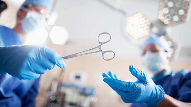 Hands of surgeon passing medical equipment tool via Getty, FangXiaNuo