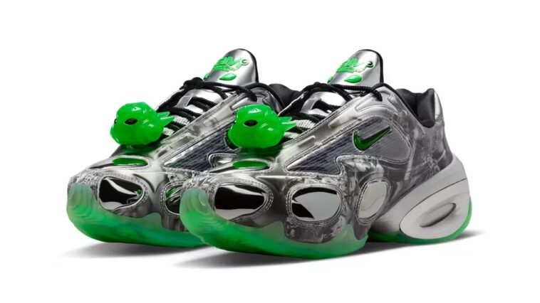 Two colorways, silver-green and orange-blue, showcase the designer’s fascination with contrast and energy. Combined with Nike’s iconic Air cushioning, the silhouette bridges science-fiction aesthetics with sport innovation, turning everyday motion into visual storytelling.